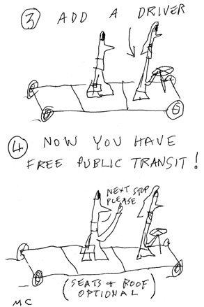 Arguments for free transit may lead to a third, red-green, eco-socialist perspective on transportation. Right now, the argument for free transit naturally complements the efforts of other transit and transportation activists (including pedestrian and cycling advocates) who see the links between the social and ecological benefits of public transit and understand that privatized transportation (auto-based or otherwise) cannot deliver these benefits.2 Within existing transit-advocacy and transit union circles, the call for free transit may yet help stop an emerging consensus among neoliberals and transit progressives in Toronto for public-private partnerships.