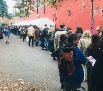 But especially: Jeremy Corbyn and Zarah Sultana from the just-emerging Your Party. It’s because of them that people are standing outside even in the damp autumnal English weather. After half an hour the queue moves, and I’m the last one they let inside. Outside remain hundreds of people who no longer fit into the theatre. Welcome to The World Transformed.
