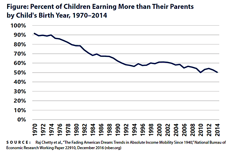 In late 2016, economist Raj Chetty and his multiple coauthors published their study “The Fading American Dream: Trends.” They documented a sharp decline in mobility in the US economy over nearly half a century. In 1970, the household income (corrected for inflation) of 92% of 30-year-olds (born in 1940) exceeded their parents’ income at the same age. By 1990, just three-fifths (60.1%) of 30-year-olds (born in 1960) lived in households with more income than their parents earned at age 30. By 2014, that figure had dropped to nearly one-half. Only 50.3% of children born in 1984 earned more than their parents at age 30. (The figure below depicts this unrelenting decline in social mobility. It shows the relationship between a cohort’s birth year, on the horizontal axis, and the share of the cohort whose income exceeded that of their parents at age 30.)