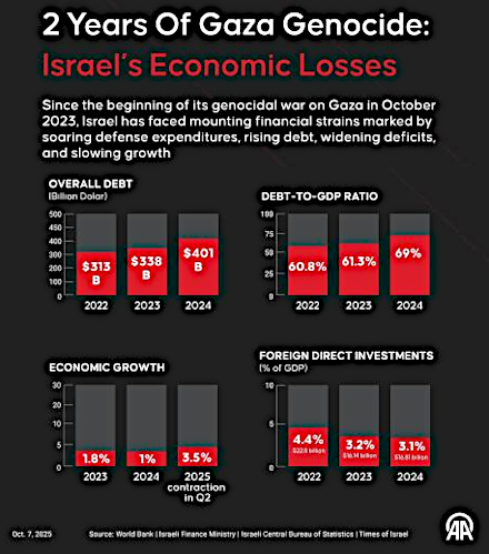 To make sense of these seemingly conflicting signals – surging markets alongside deepening social and economic turmoil – it is necessary to look beyond traditional indicators. Israeli economic researcher and BDS activist Shir Hever argues that Israel is now operating in what he calls a “zombie economy,” one kept moving through massive military expenditure, foreign credit, and political denial.