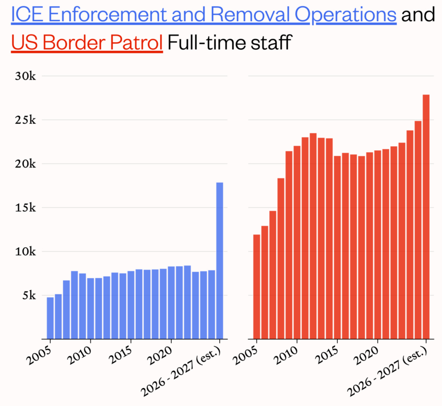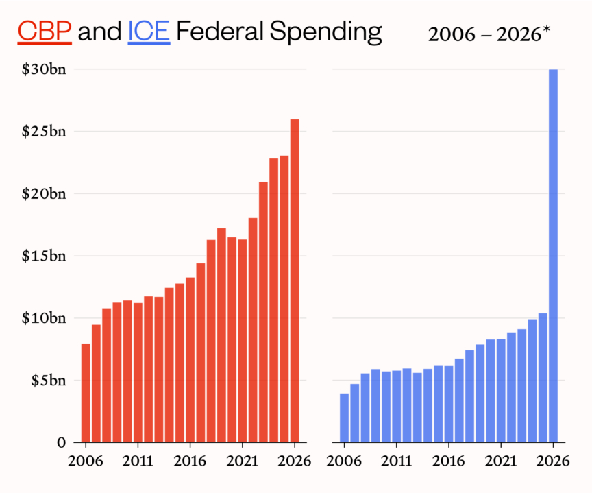 The longstanding practices of these agencies are well-suited to our present moment of flexible citizenship and vanishing due process. Their dramatic expansion marks an unprecedented enhancement of the domestic security apparatus. But while this development is deeply troubling, it is not sudden or inexplicable, nor is it merely a top-down project of the Trump administration. The unconditional flow of money, equipment, and resources to DHS and its immigration sub-agencies – overseen by multiple previous administrations – had already allowed them to operate with minimal accountability for decades. This, in turn, nourished an increasingly assertive anti-migrant politics among the agency’s rank-and-file, whose militant unions fought to override resistance from employers and policymakers alike. Both Democrats and Republicans, following this bipartisan logic, spent years lurching rightward on immigration. Unconstrained resources have thus enabled the growth of the far-right enforcement regime; reckoning with its budgetary and institutional foundations will be necessary to stop it. •