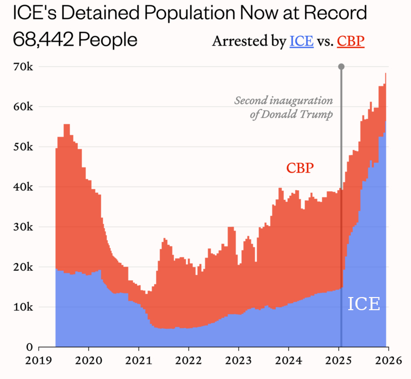 While the above figures are impressive by any standard, the shift here is not merely quantitative. The emerging enforcement regime melds federal law enforcement and other personnel into an inter-operational whole, focused on mass deportations and ideological policing. The White House has detailed at least 33,000 additional federal employees for ICE and Customs and Border Protection (CPB) duties, taking them from the Justice Department] the Bureau of Prisons; Drug Enforcement Administration; FBI; US Marshal Service; and Alcohol, Tobacco, Firearms and Explosives. FEMA employees are now tasked with sorting through thousands of ICE job applications, while the agency’s emergency funds have been siphoned to fund detention camps. A December report released by Senate Democrats shows that $2-billion in Pentagon funds have been diverted for immigration enforcement. The number of deputized immigration agents is even higher when counting National Guard troops occupying US cities or local police who have been pulled into immigration task forces.