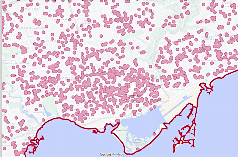 Just how confining the bubble zones could be in a city like Toronto was illustrated in a map developed by the publication Toronto Today to illustrate the impact of 100-metre areas of restriction. But even the 50-metre limitation eventually enacted would look similar.