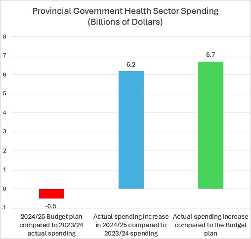 The total health sector spend was also $6.7-billion more than the Budget plan. In other words, the government planned to cut healthcare funding by half a billion dollars in 2024/25 but ended up increasing it by 7.2%. Again, the Budget plan was a very unreliable indicator of actual spending on healthcare as reported in the audited public accounts.