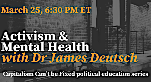 Every Wednesday at 6:30pm, March 25 to May 13, 2026. Capitalism Can't Be Fixed Activism and Mental Health with Dr. James Deutsch.